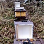 Nu har mina bin fått ner vintermaten och jag lägger på en ny förpackning med Apiguard. När jag lyfter av foderlådan så kollar jag alltid på undersidan, har varit med om att drottningen sitter där. Sen lämnar jag foderlådan bredvid kupan så bina kan lämna i lugn och ro. Nästa gång jag kommer till bigården är det inga bin kvar i foderlådan.