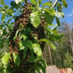 Idag på eftermiddagen fick jag ett samtal om en bisvärm i ett träd i Dalkarsberg utanför Nora. Så det var bara att packa bilen och åka 37km. Den satt i lagom höjd. Skakade ner svärmen i en låda och eftersom drottningen följde med så flög resten av bina in i lådan. Nu finns svärmen i en av mina bigårdar.